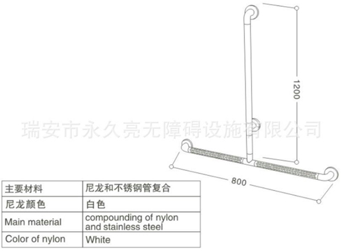 產(chǎn)品結(jié)構(gòu):抗菌尼龍無障礙扶手為彩色尼龍和不銹鋼管復(fù)合而成,其外層尼龍直徑為35*3.5mm,內(nèi)襯不銹鋼管直徑28*1.2mm復(fù)合而成。